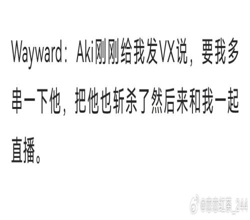 | 体育资讯5月10日报道宣称 近日,前TES上单wayward在直播时把Aki微信私聊调侃的玩笑话公开出来,后续感觉行为有些不妥后在直播间向Aki道歉。