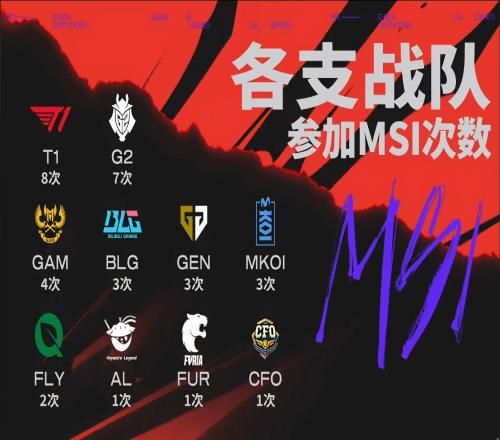 各队参加MSI次数统计:豪门T1以8次遥遥领先G2七次第二BLG并列第四