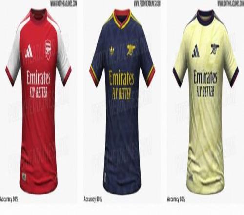 阿森纳下赛季的主场球衣拼接了两种不同的红色,较深的红色将用于衣领、袖口和三条杠。 客场球衣则以海军蓝底色,搭配黄色加农炮队徽、三叶草标志,以及红色、海军蓝、黄色的拼色领口及配套袖口;第三球衣采用浅黄色设计,配以海军蓝队徽和闪电图案印花——这一来自上世纪 90 年代的标志性设计在近几个赛季被多次致敬。