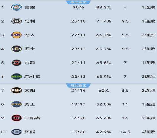 目前为止,太阳以21胜14负排名西部第七,落后第六的森林狼1.5个胜场,湖人则以22胜11负将战绩重新提升至第三。